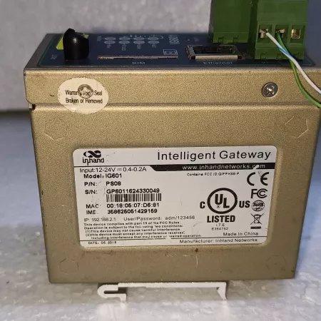 The InHand IG601 (IG601) is a smart gateway that combines 3G cellular routing, Modbus data acquisition, text (SMS) alarms, and VPN. It is a compact industrial grade gateway that establishes a new standard in remote access. The IG601 works with the cloud based InHand Device Touch to access a PLC's serial or Ethernet port. This allows technicians to program remote PLCs as if the devices were by their side. INPUT : 12-24VDC 0.4-0.2A Model : IG601 P/N : PS08 S/N : GP6011624330049 Manufacturer : InHand Networks Made in China